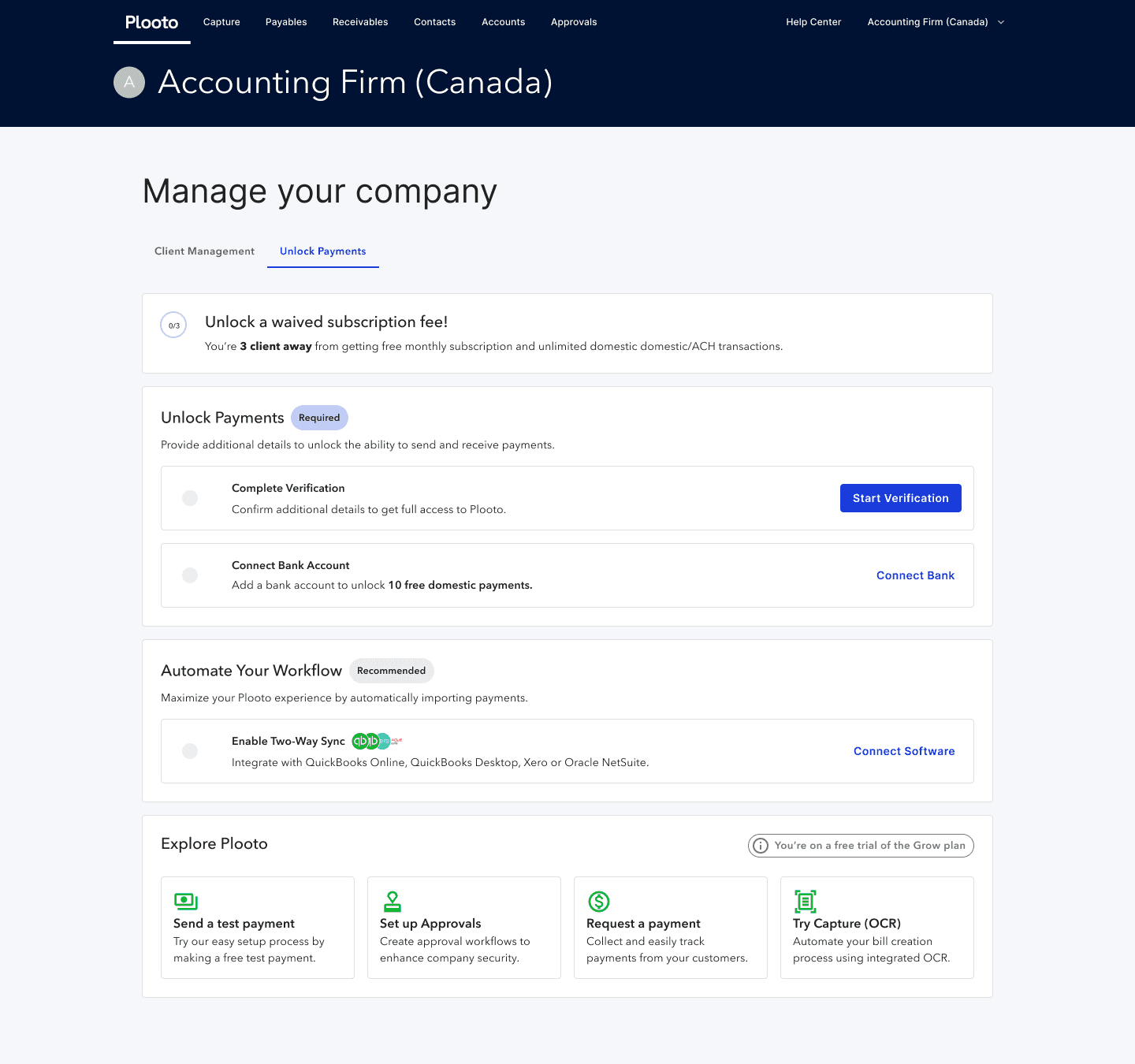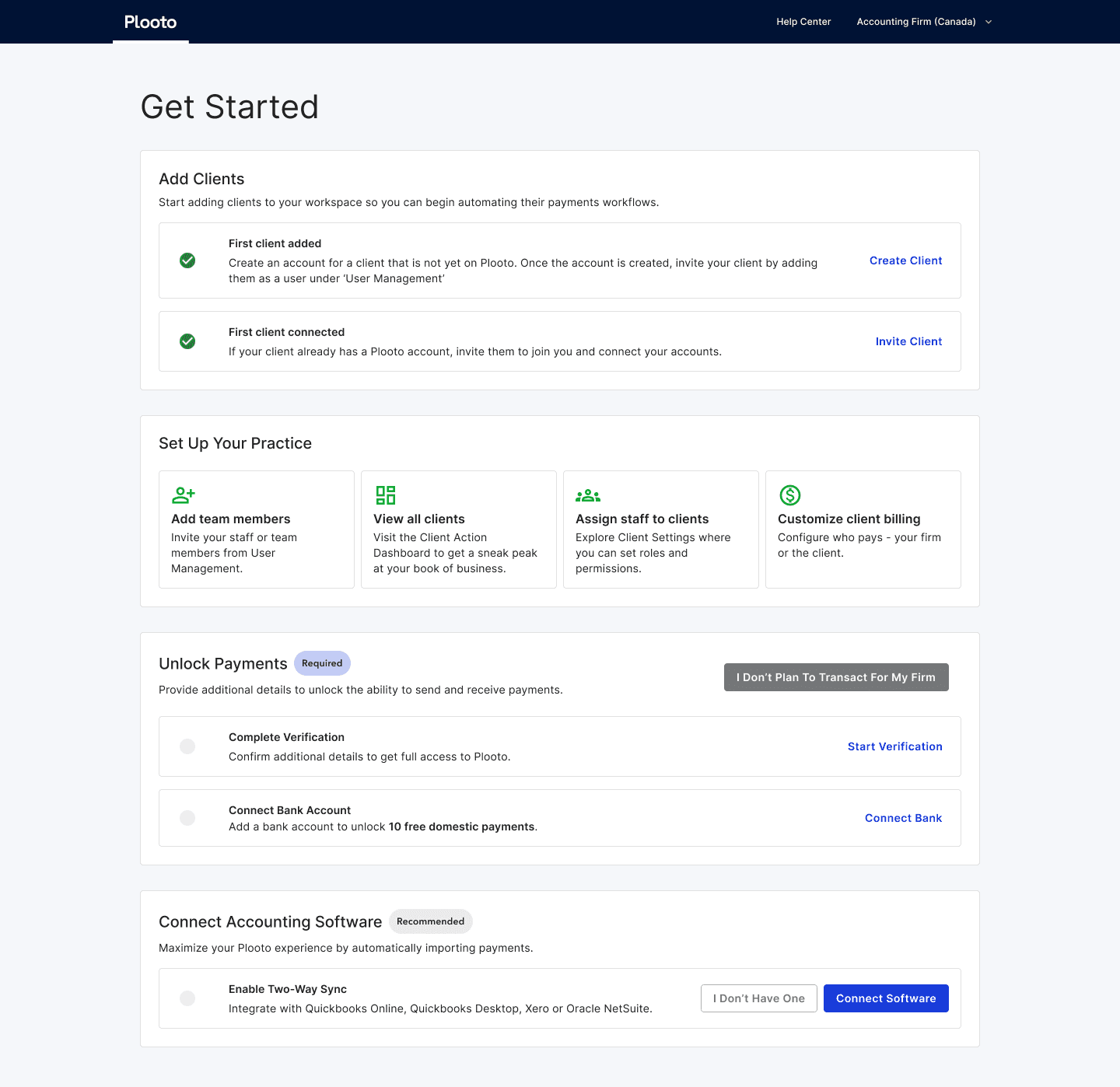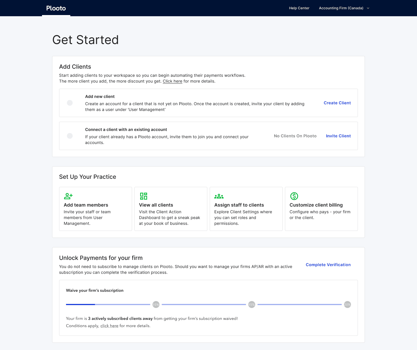 Action buttons surface the most important tasks, reducing friction and supporting efficient daily workflows. Even after users unlock payments and see a new dashboard, the firm/client management tab will still be found as the primary tab users land on.
