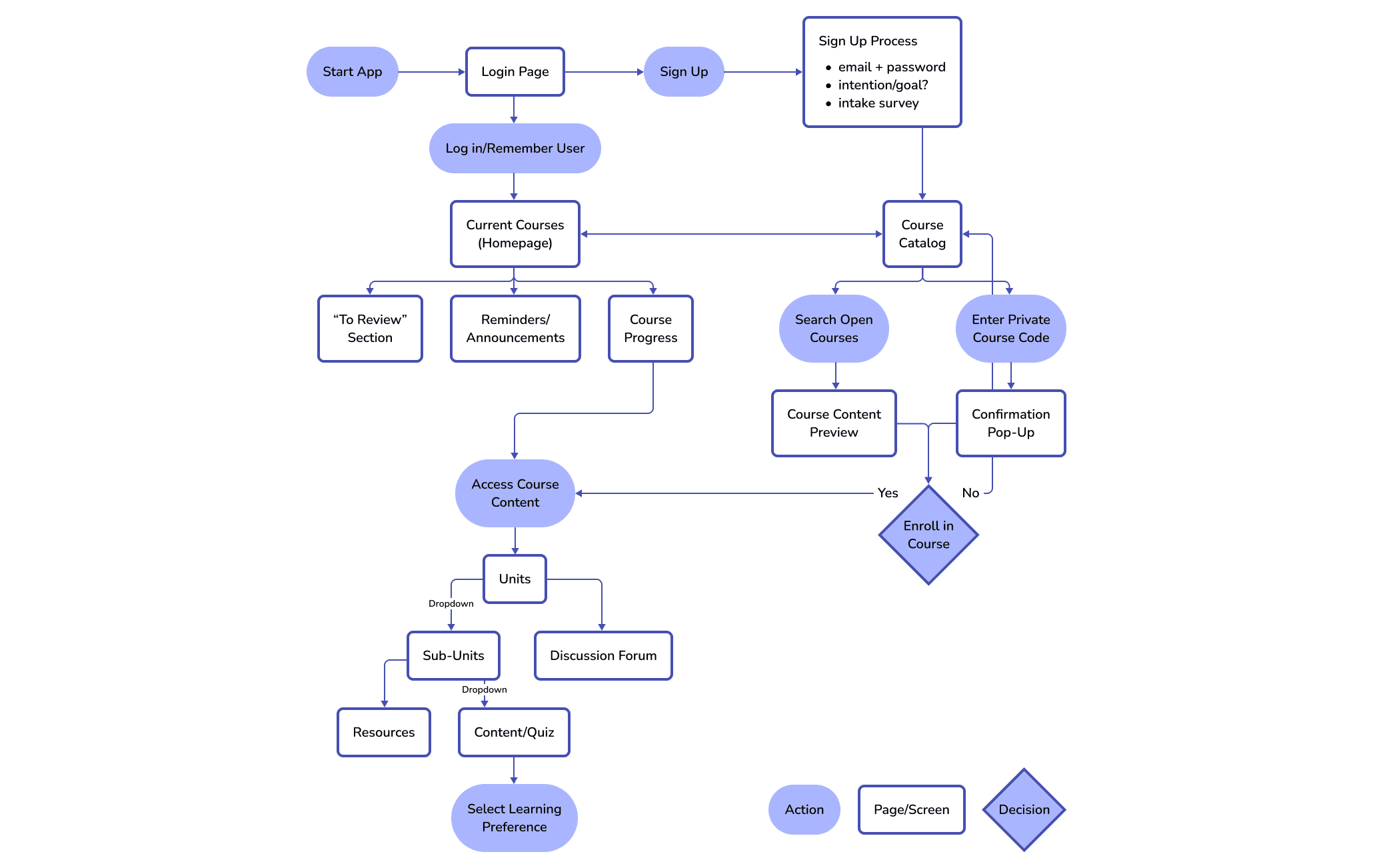 As the other designer and I were thinking of what the app should have, I soon realized that we had different mental models of the product. I requested that we make a user flow to have a visual understanding of what each screen or interaction should do in our app. This is what we came up with: