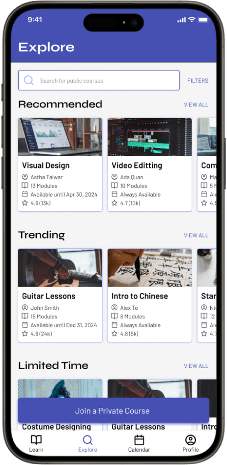 While users can join a private course made by their professors, tutor, etc., they will also have a variety of open/public courses to choose from as well!